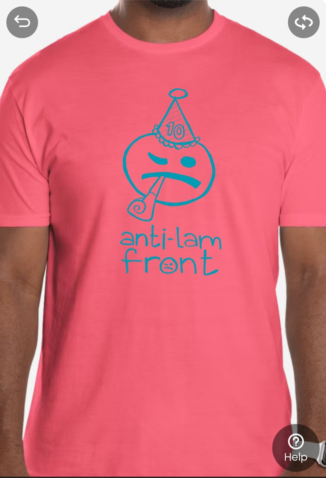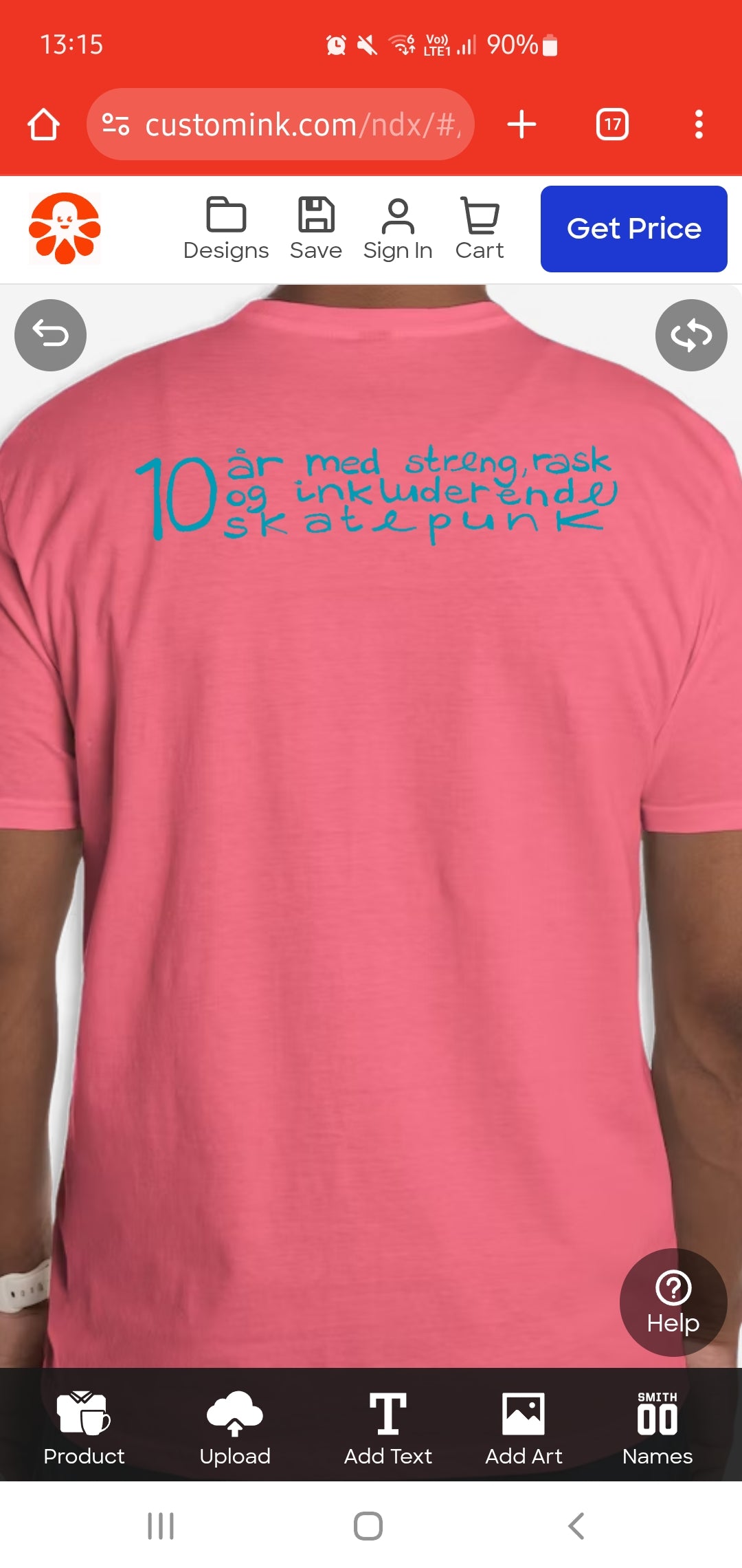Turkis print (foran og bak) på rosa Gildan Softstyle-skjorte. Ikke så rent lite sprek i fargen, i følge eksperter innen mote og trender.